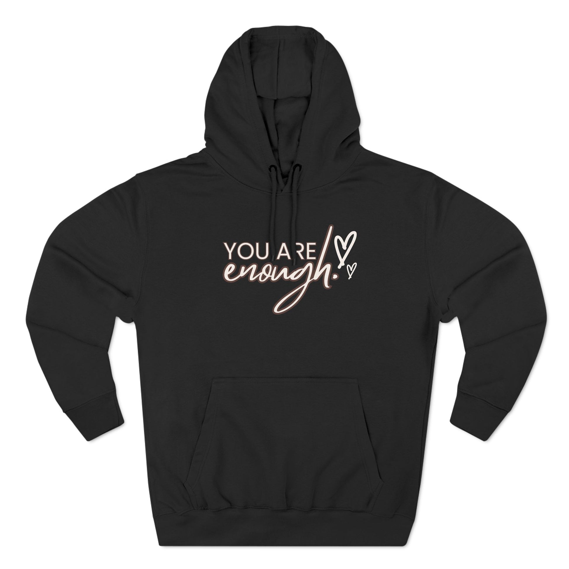 A cozy and comforting hoodie with the message 'You are enough' embroidered on the chest. Perfect for colder days and lounging at home, this hoodie offers a soft hand-feel and a spacious kangaroo pocket to keep your hands warm.